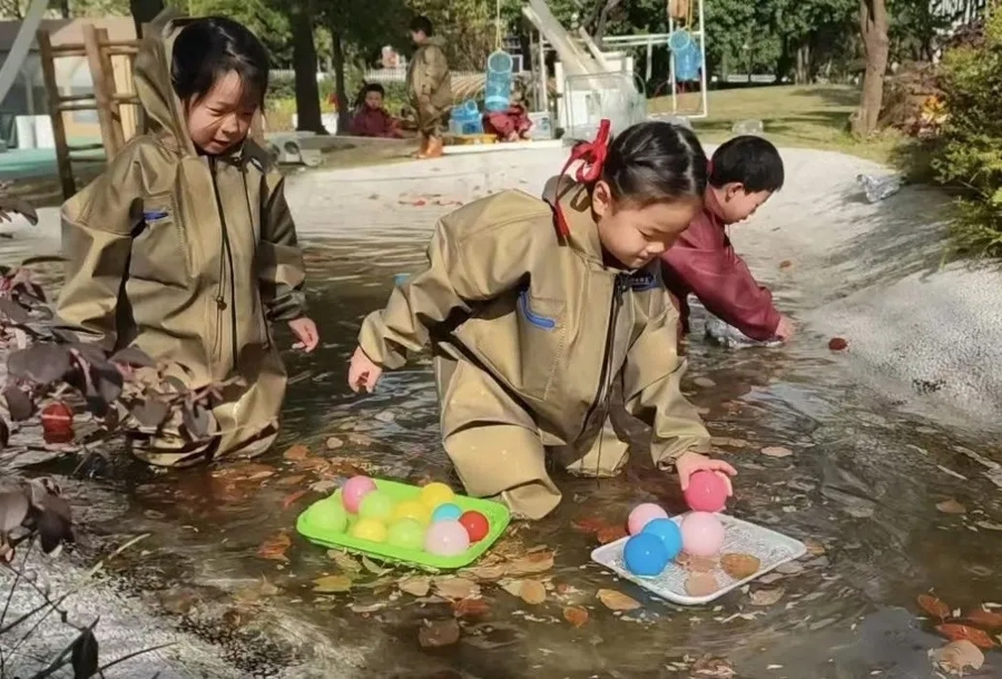 另一边的沙水区,孩子们试图制作一艘载着小球过河的小船,却被材质选择的问题难住了。“为什么树叶和海洋球能漂浮在水上,纸船却会沉入水中?”“想想我们用的纸巾,碰到水后会出现什么变化?”“原来是因为纸张吸收水分会变重!”……在AI工具和老师的指引下,孩子们改用泡沫板,重新设计了船型,将泡沫板的四周折起,小船最终稳稳漂浮。